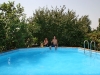 בריכת שחייה עגולה ומרווחת להתרעננות בחודשי הקיץ.  לצידי הבריכה ריהוט גן מעץ, נדנדות מעוצבות